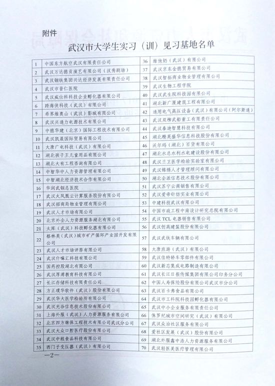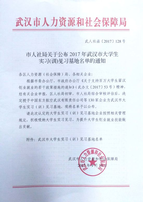 為大力實施“百萬大學生留漢創業就業計劃”,貫徹落實武漢市委辦公廳、市政府辦公廳《關于支持百萬大學生留漢創業就業的若干政策措施》文件精神,武漢市人力資源和社會保障局組織專班通過實地走訪的形式對企業進行考察和評估,經多輪遴選,我司被確認為2017年武漢市大學生實習(訓)見習基地。