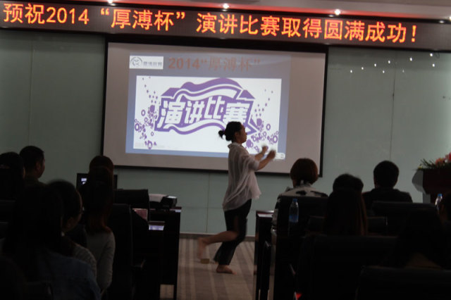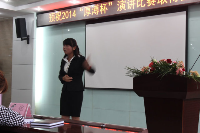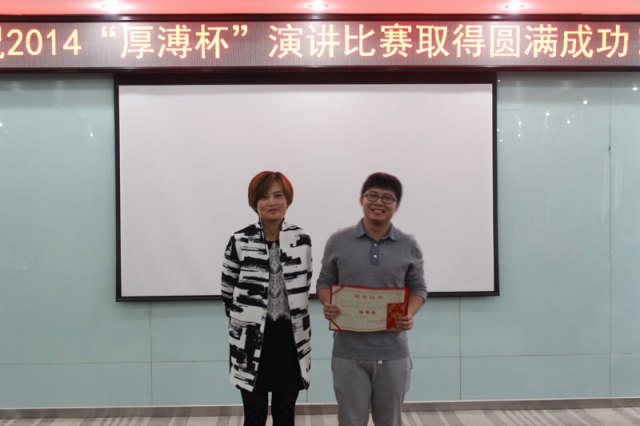 2014年10月31日,“厚溥杯”演講比賽決賽如期在光谷軟件園C6棟109多功能會議廳舉行。評委會由武漢景寧人力資源服務有限公司、武漢厚溥教育科技有限公司專家及各高校教務相關領導組成,通過嚴密的賽制,最終決出特等獎1名、一等獎3名、二等獎5名、優秀獎8名,而優秀指導老師則被湖北三峽職業技術學院劉靚老師獲得。