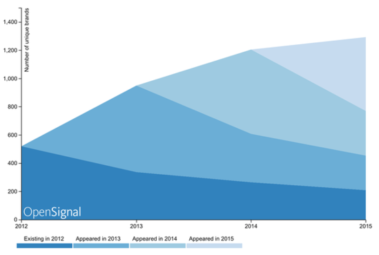 圖中最大的變化不是三星的主要競爭對手?jǐn)U展了多少份額,而是上百家小型廠商的出現(xiàn)。OpenSignal表示發(fā)現(xiàn)了1294家獨立生產(chǎn)商,其中超過1000家在2012年的時候還根本不存在。值得注意的是,一些2012年還存在的廠商現(xiàn)在已經(jīng)消失了,所以我們看到的增幅或許沒有那么大。